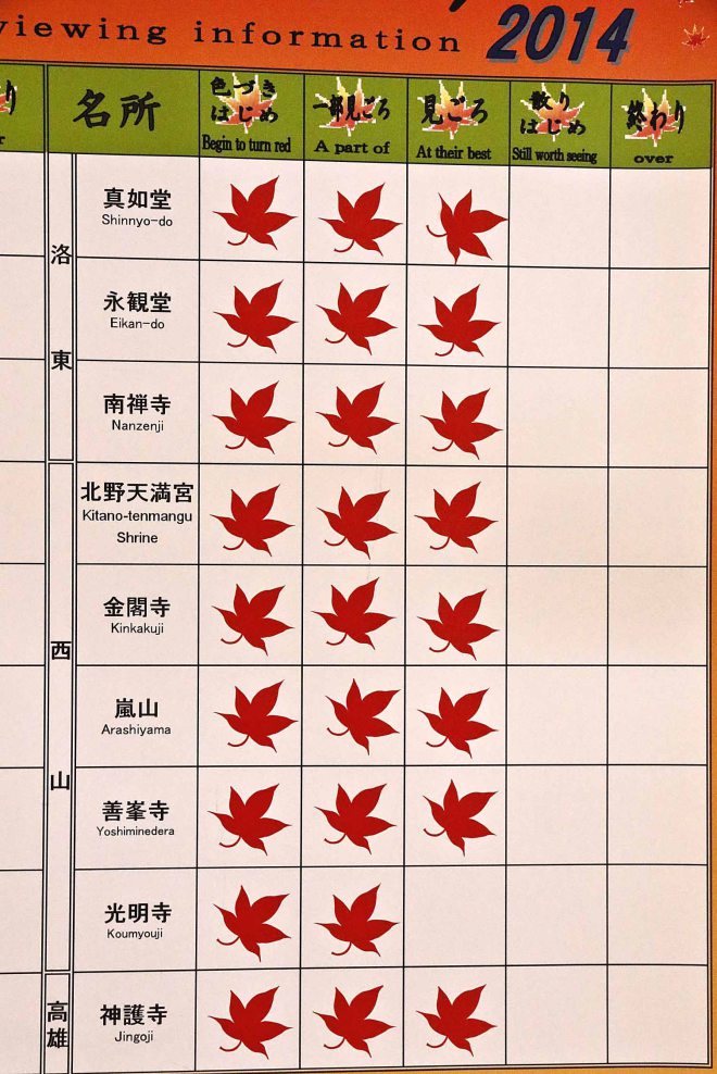 This year the autumn viewing season for maples has been excellent. A sign in our hotel indicates the stage of leaf coloring in several of the popular viewing areas. It looks like we visited Kyoto at the best time, too bad I did not have the opportunity to visit any of the gardens.