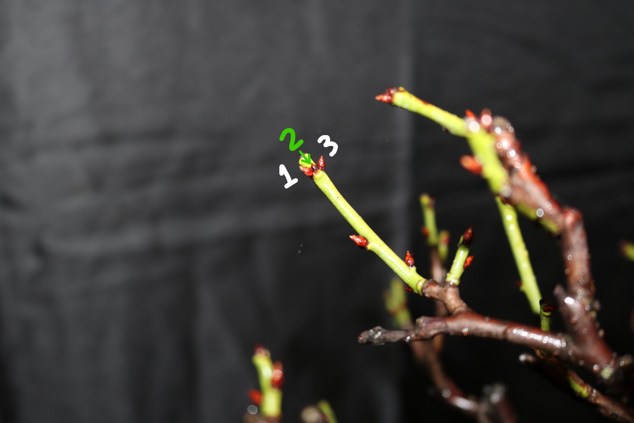 1 & 3 are flower buds, 2 is a vegetative bud. Sometimes, oftentimes, ume will produce flower buds, and no vegetative buds, making it a challenge to prune them to keep foliage close to the trunk. More on that another day. I’ve been photographing another experiment for the last couple years…but I digress…
