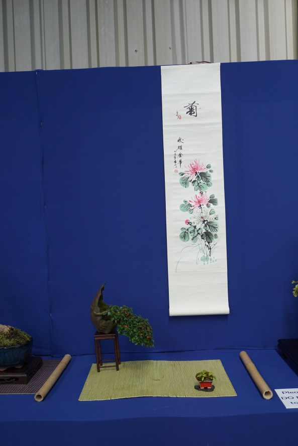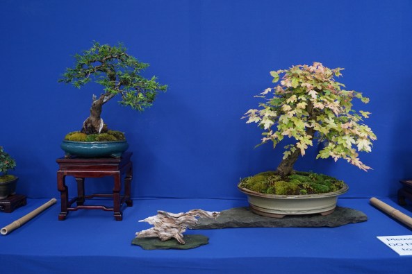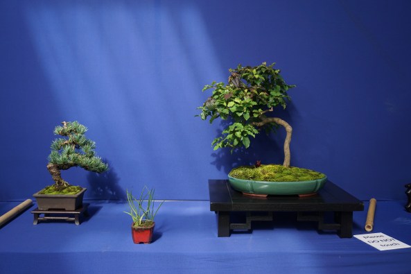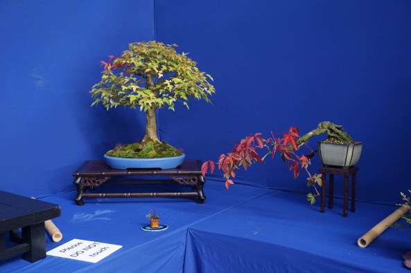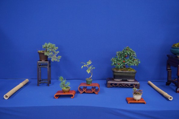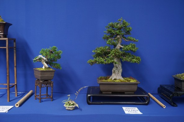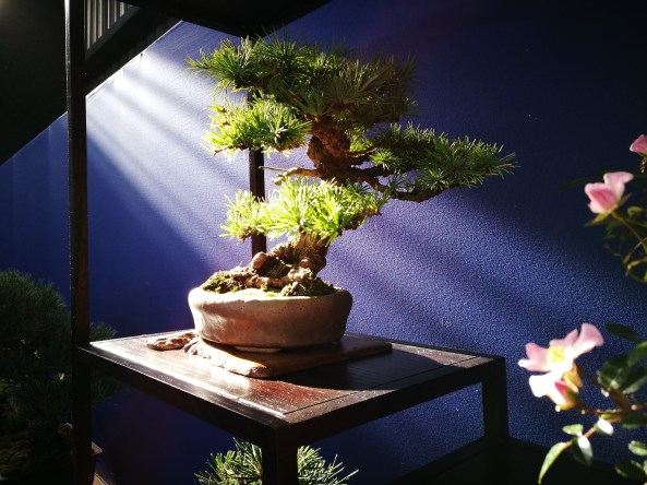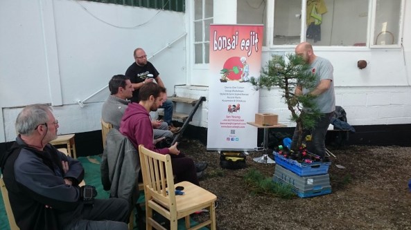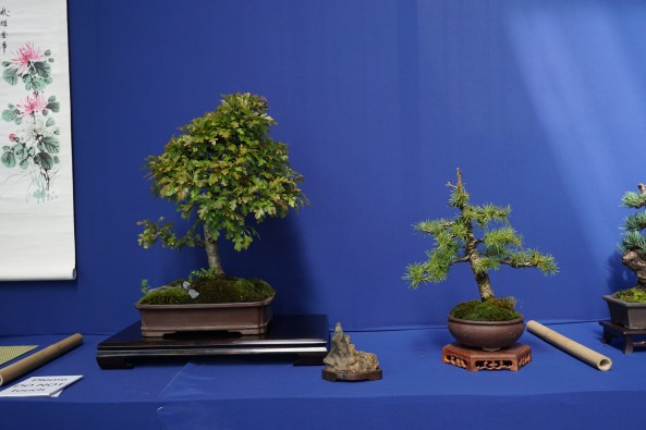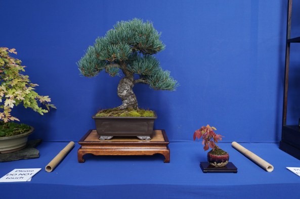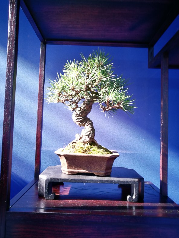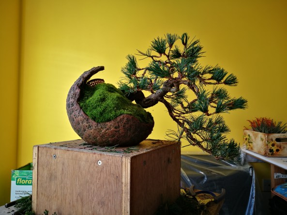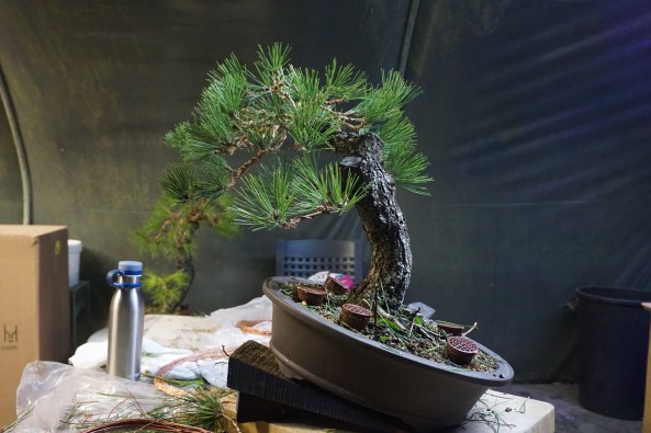 Day 6 was the Exhibition and I was delighted to put on a shohin display along with the club members. We set up and had an hour before opening, so we did a critique of the displays with all the club members and exhibitors. I was given a tall Scot’s Pine to style in the demo.