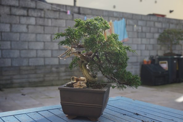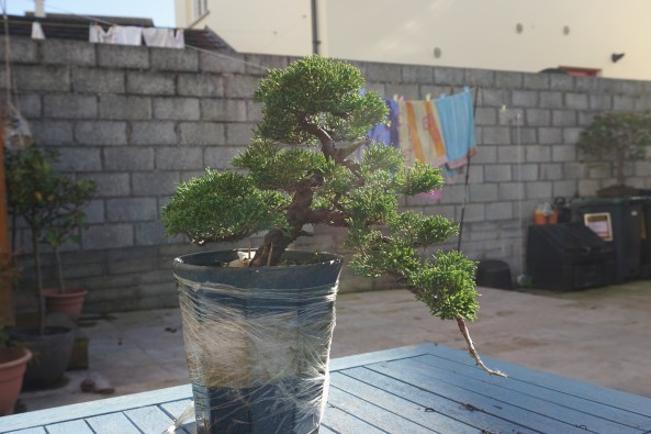 This little Mugo Pine is an oversized pot was a challenge. Humble material with a lot of the branches coming from the same spot high up in the tree. How to make an interesting image and at the same time reduce the branches at the top to stop it becoming an unsightly swelling.