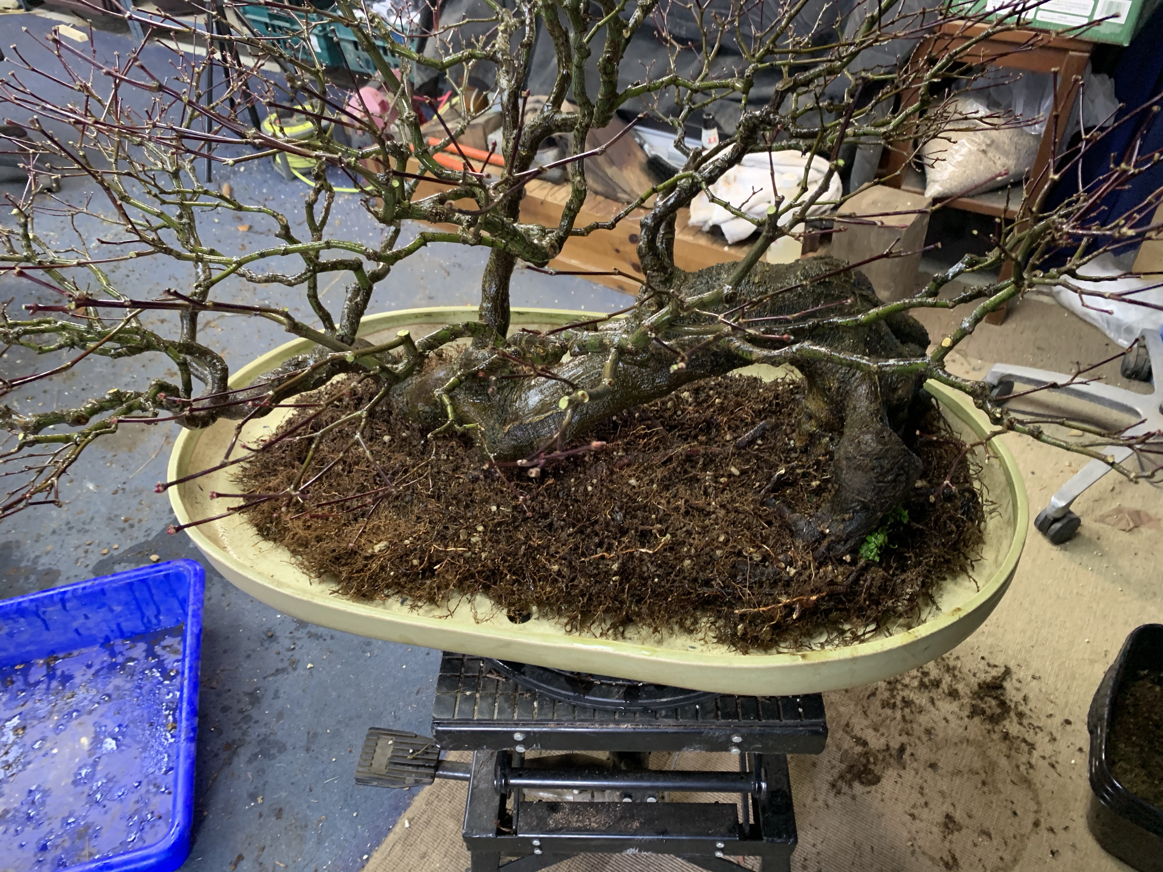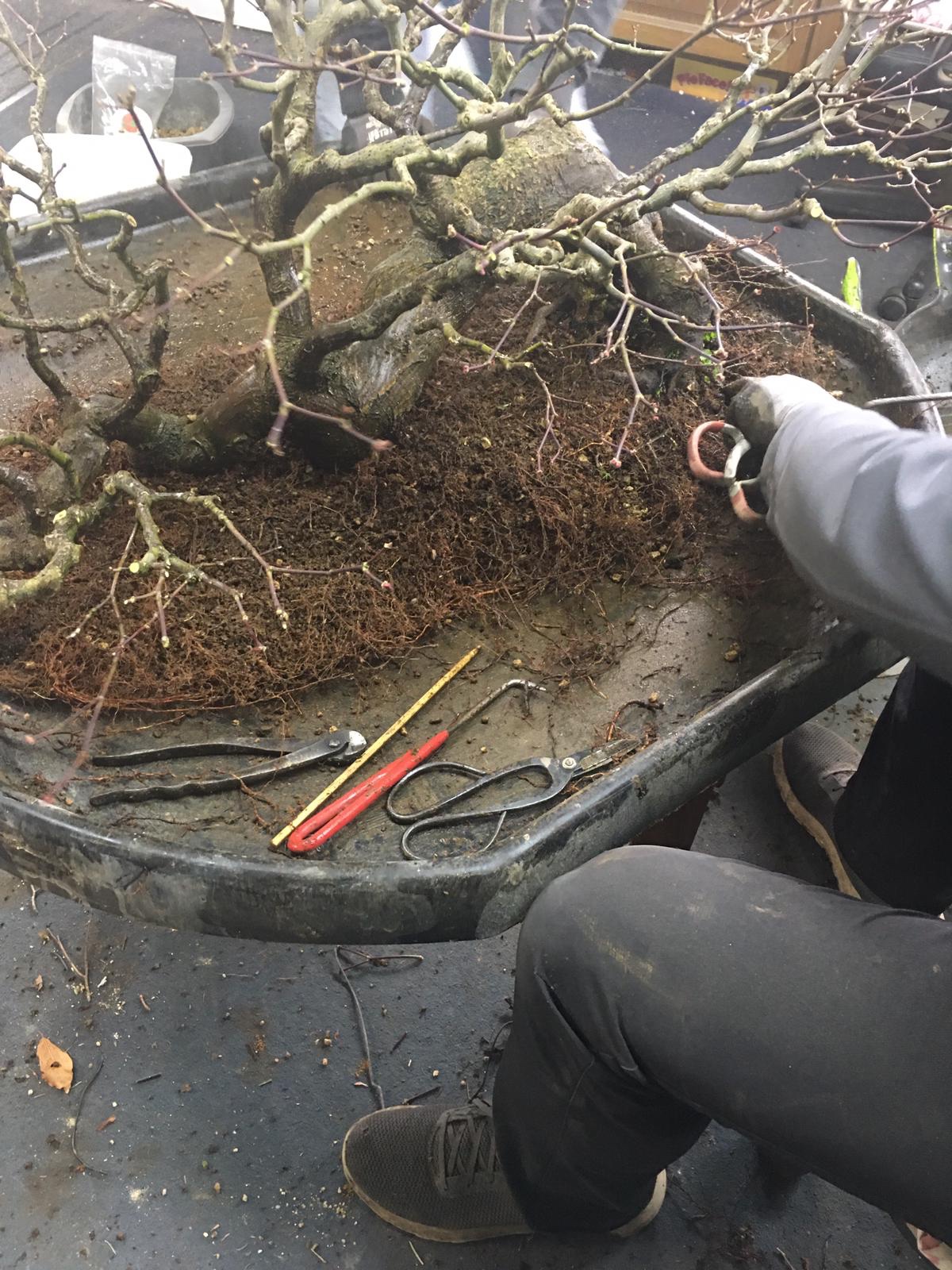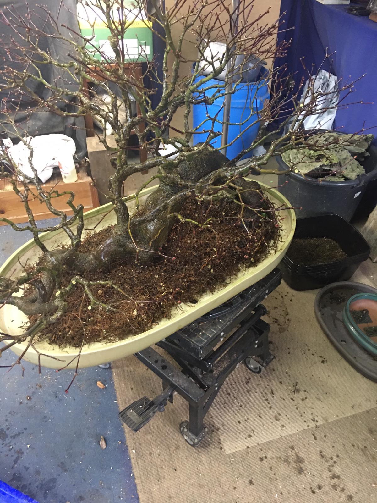 We got it home and potted up as above. The tree was dense with a lot of branches that were not usable in a design so I cleared it out to allow light to penetrate for back budding.