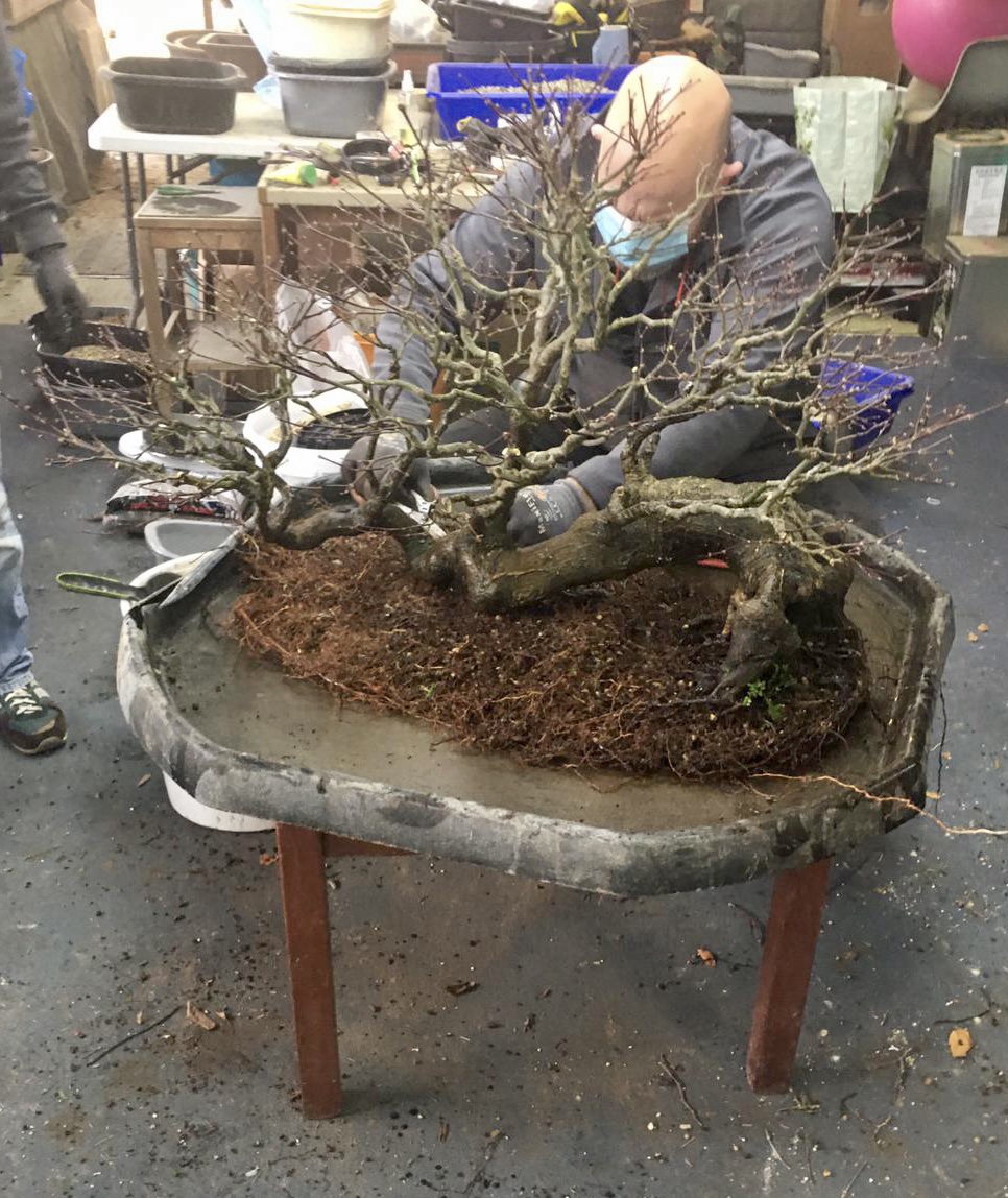 In 2019 the tree moved about 200 yards from Stephen’s home to Kris’s place. The size and weight of the tree meant that Stephen moved the tree on and who better than a friend who is easy to visit. Today we masked up and got down to the task of repotting the tree. It got a trim first. A good time to make cuts as having the roots worked means they won’t bleed. Here’s the full process step by step.